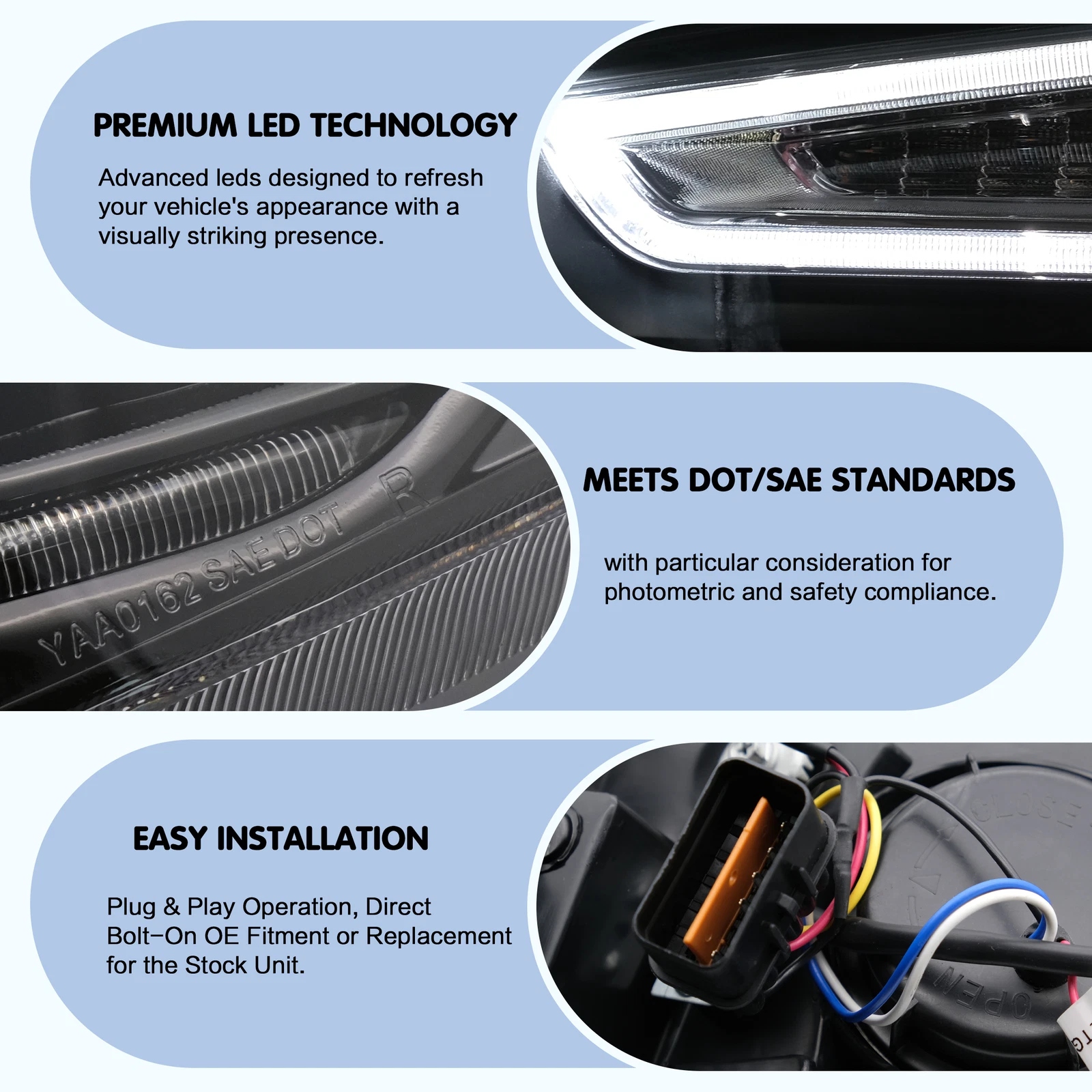 This item has the same connections and wires as the original headlights. The Package includes a pair of headlights including left and right side/User manual/rubber ring/ ACC Wire harness.
